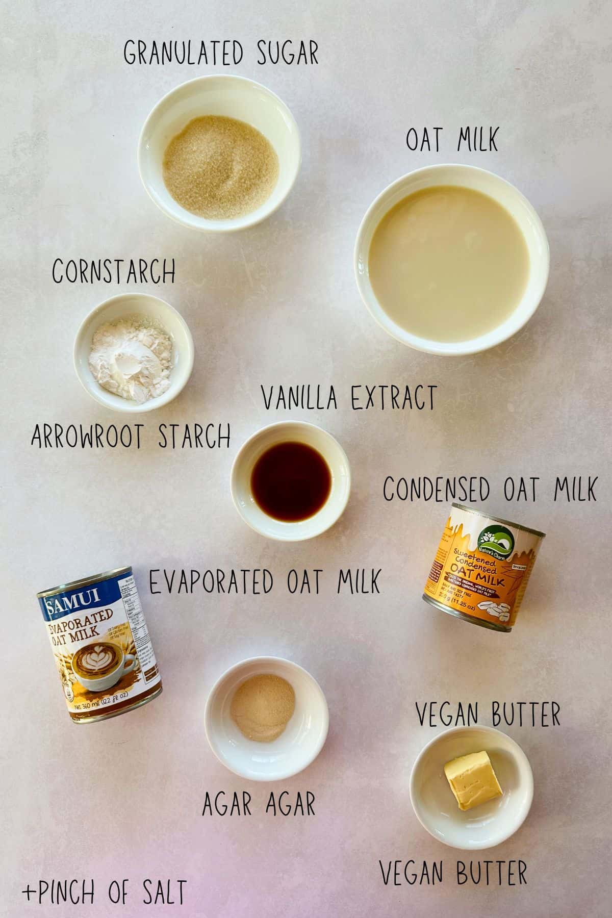 Cornstarch + Arrowroot Powder - This duo mimics the thickening power of eggs, giving this vegan flan its classic custard feel. Using both cornstarch and arrowroot powder in vegan flan is my secret to that dreamy, creamy-yet-sliceable texture. Cornstarch adds structure, while arrowroot keeps things smooth and silky.